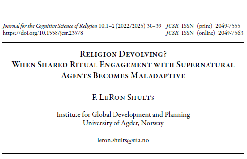 Just published in JCSR – an article titled “Religion Devolving? When Shared Ritual Engagement with Supernatural Agents becomes Maladaptive.” Available here: https://journal.equinoxpub.com/JCSR